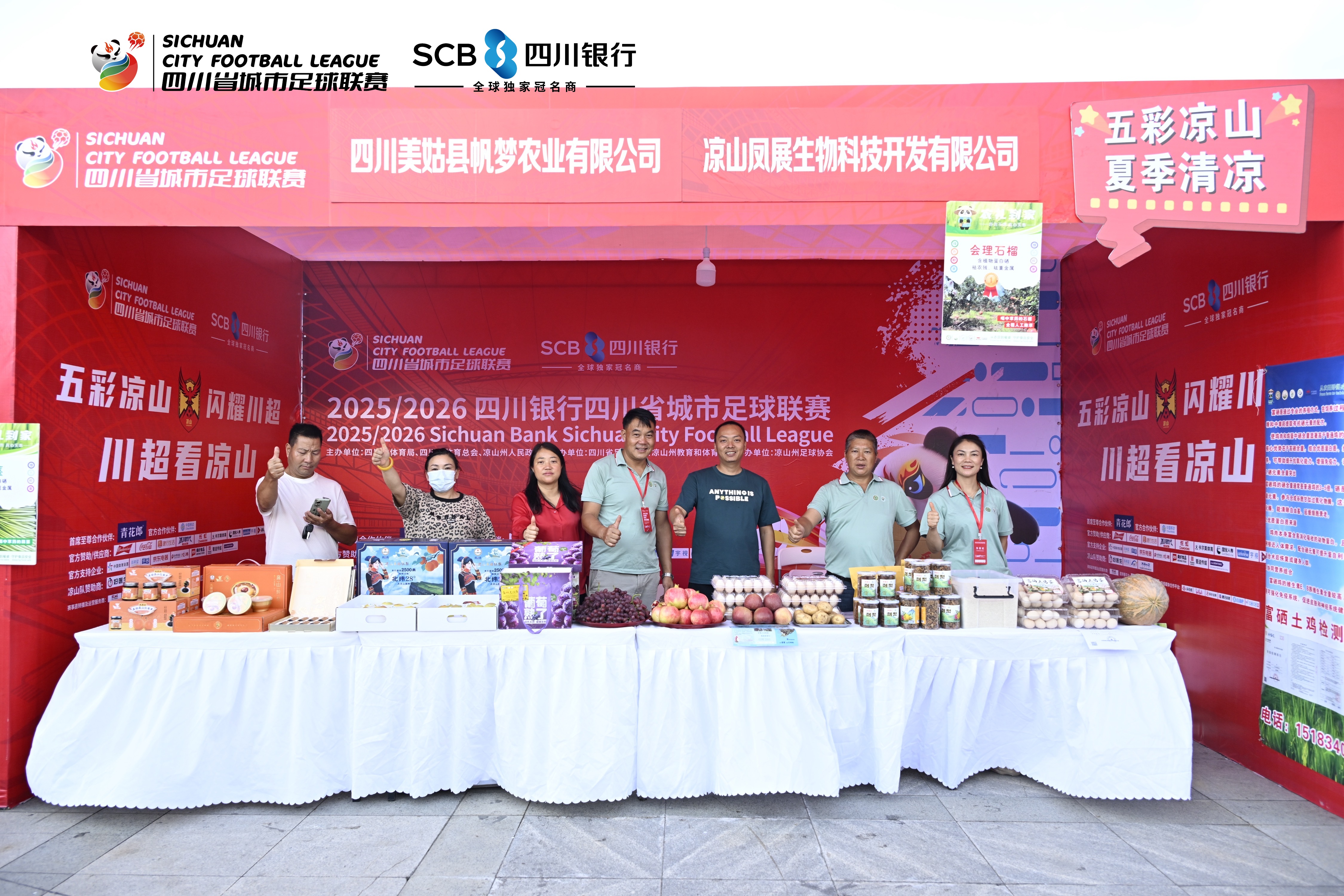 对战开始之前,在比赛场地凉山民族体育场外,设置了农文商市集,30个展台展出了大凉山优质特色农产品、商品,展示各类美景、美食,吸引了众多球迷和游客参与。